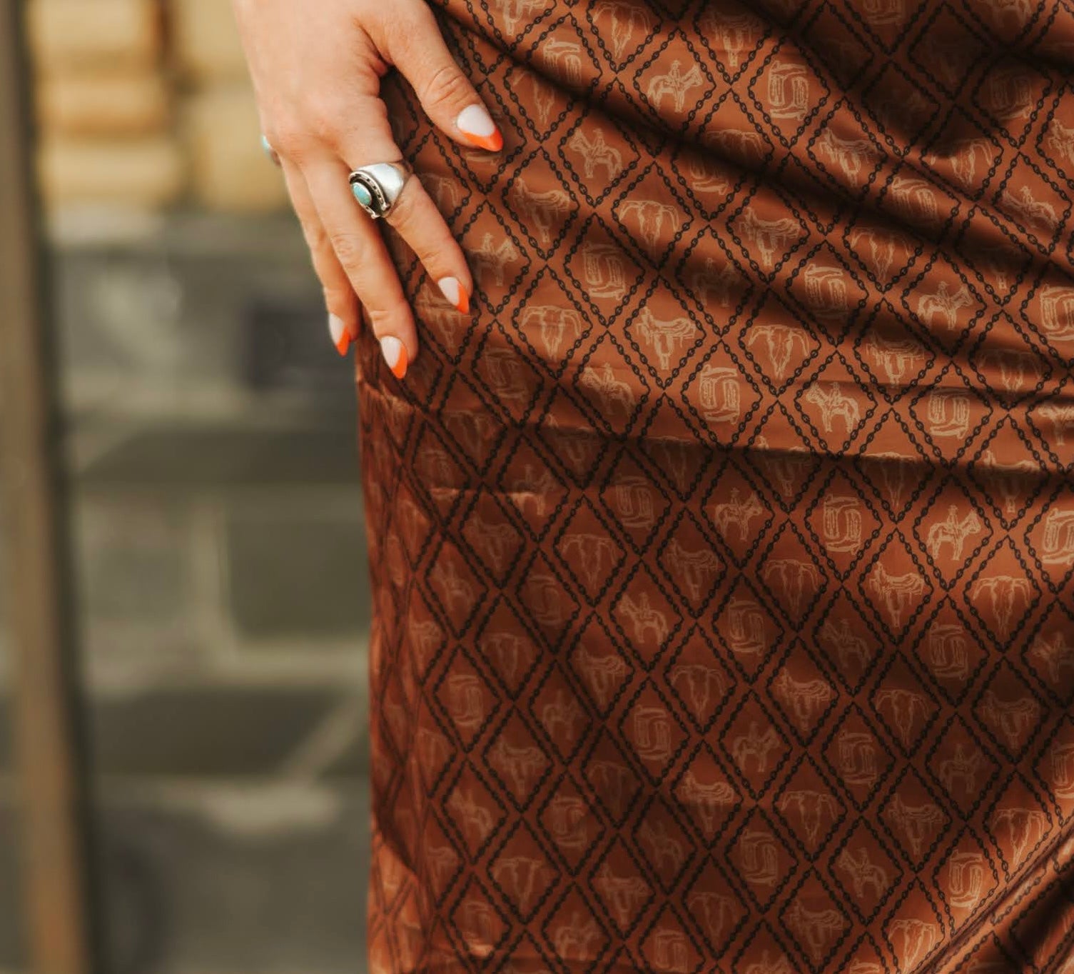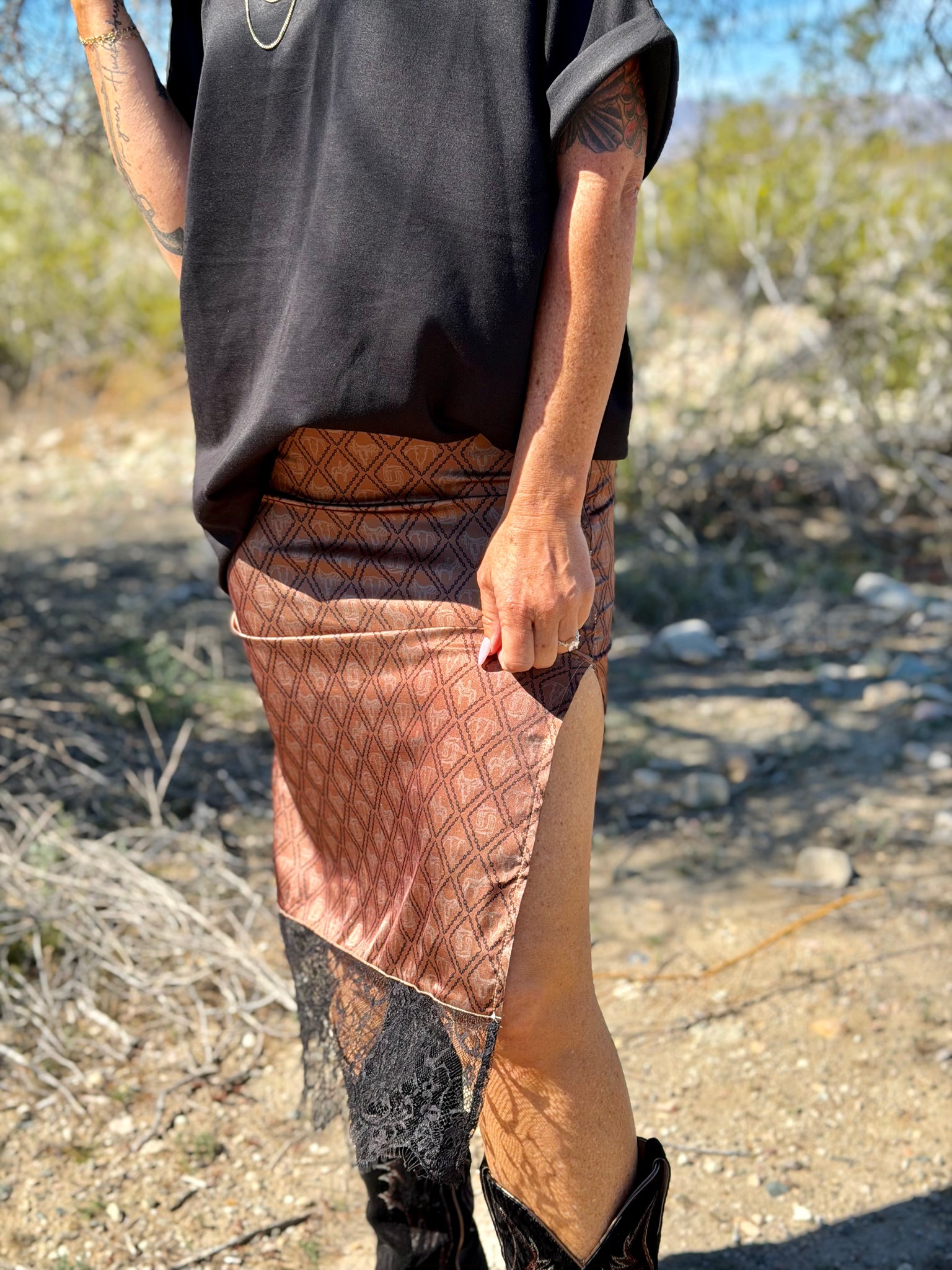 Chocolate brown with a satin feel. Side slit, side zipper and black lace.