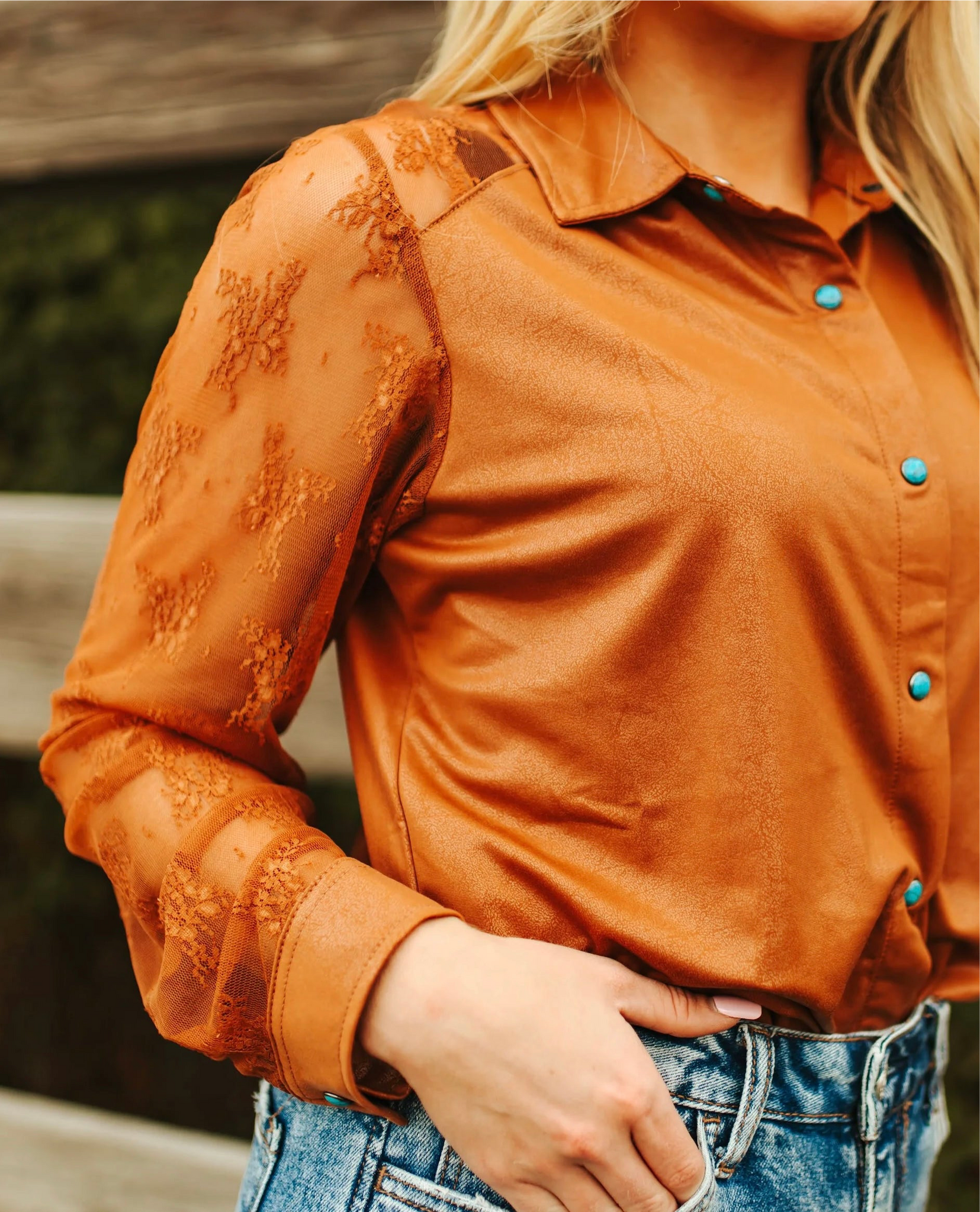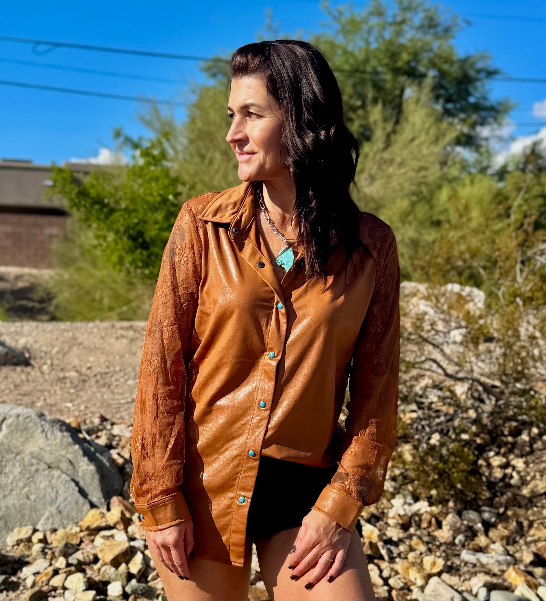 what's better than a satin button up with turquoise buttons? A LACE SLEEVE satin button up with turquoise buttons.... cause winter should be over soon let's que the sunshine... LACE will trend... and we ARE HERE FOR IT.