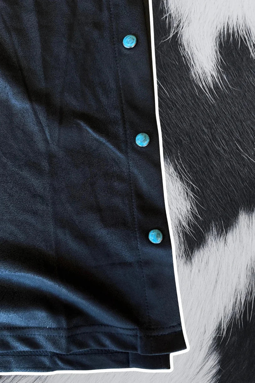 It's got the stretch. It's got that leather look. & its got the turquoise pearl snap.